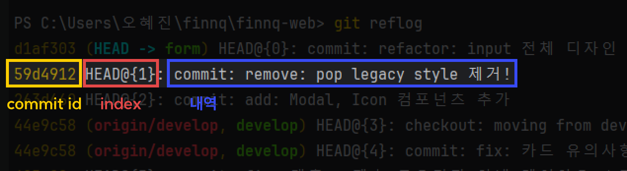 reflog란? reflog란 git에서 가리키는 referenced commit이 변경된 내역이다. reflog를 기록하는 것은 대표적으로 HEAD와 branch 두가지이다. HEAD의 reflog HEAD의 reflog 경우 새로운 커밋이 생기거나, branch가 switch